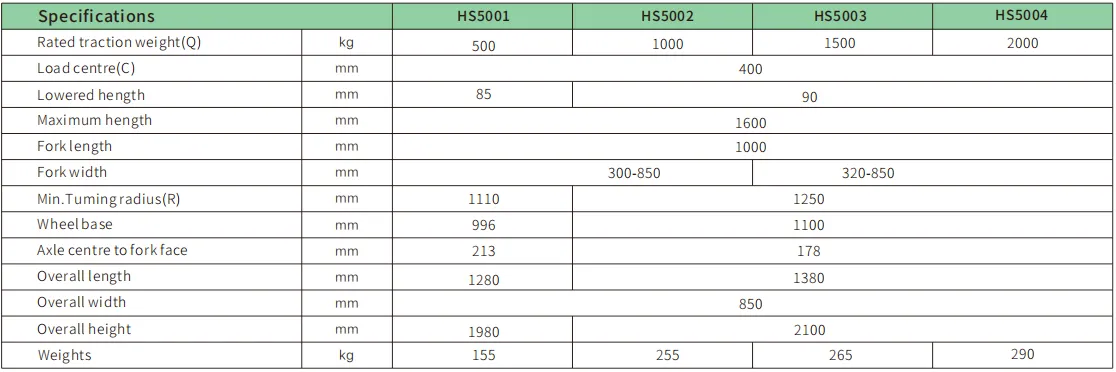Fork width adjustable from 300 to 850 mm, allowing compatibility with various pallet sizes.